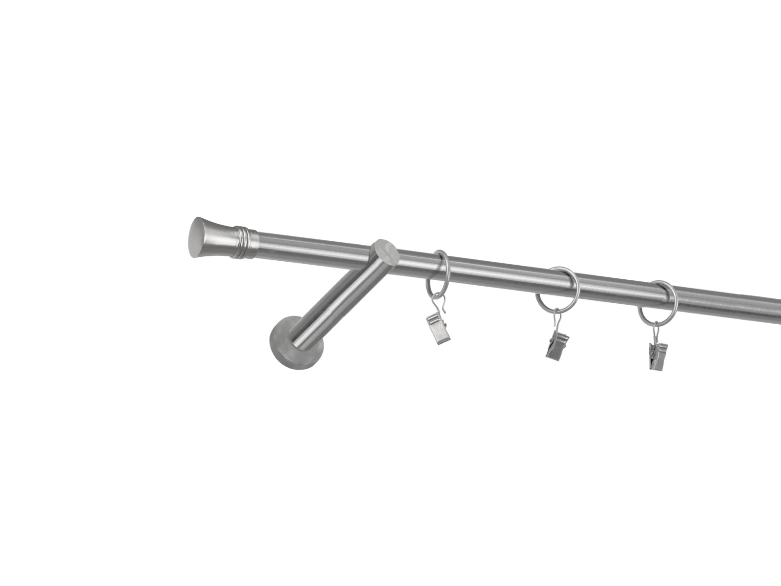 • V prípade, že ste si objednali ku garniži príslušenstvo, navlečte krúžky so štipcami na tyč., Následne dotiahnite poistné skrutky na držiaku, ktoré zabránia pohybu tyče.