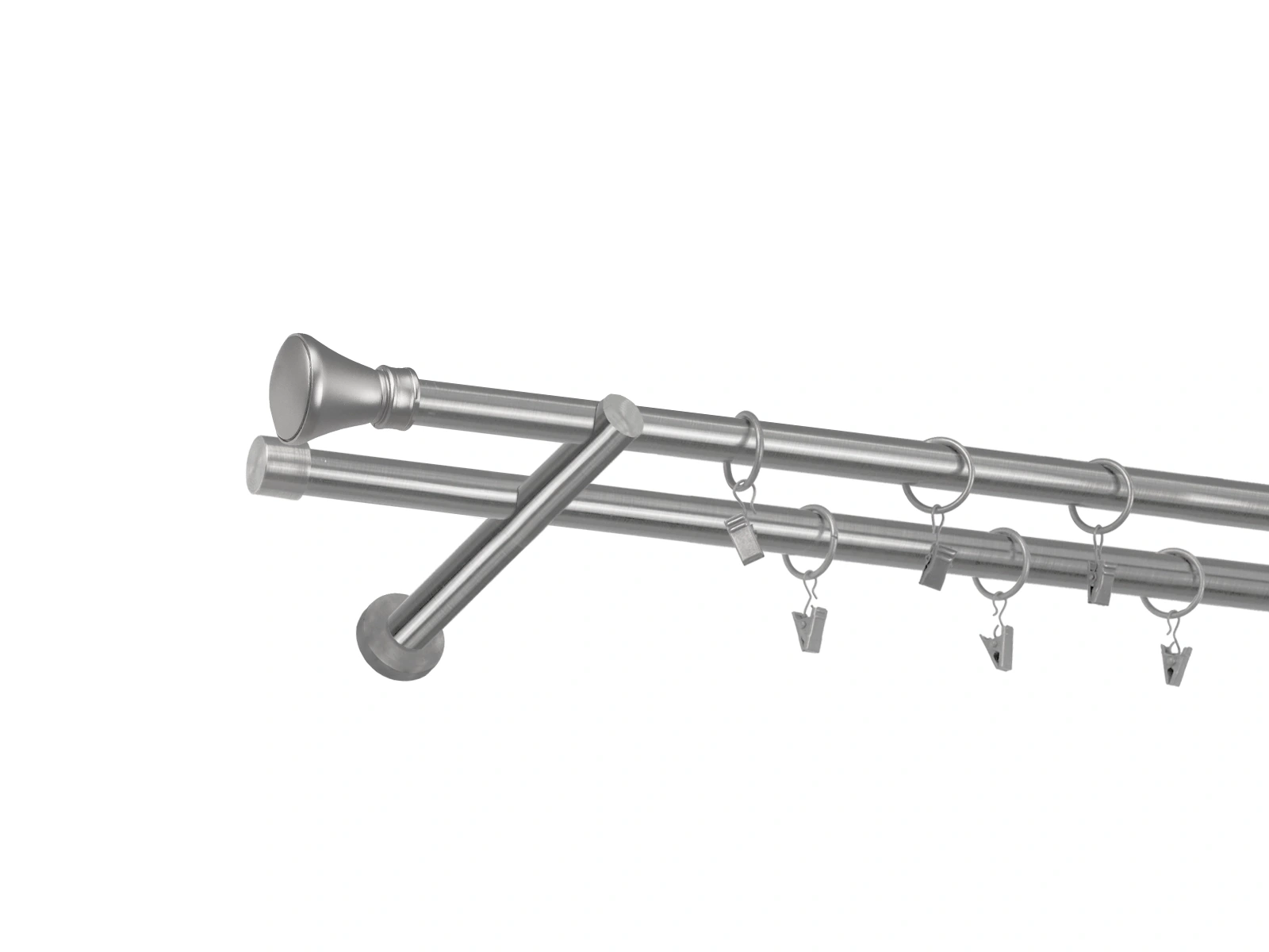 • Dĺžka 1600 mm - tyč 19mm - 1600mm - 2ks, držiak dvojitý - 2ks, koncovka - 2ks, koncovka zadná (PULLO) - 2ks, krúžok so štipcom - 30ks (pri výbere parametra príslušenstvo s krúžkami so štipcom), skrutky a hmoždinky na montáž