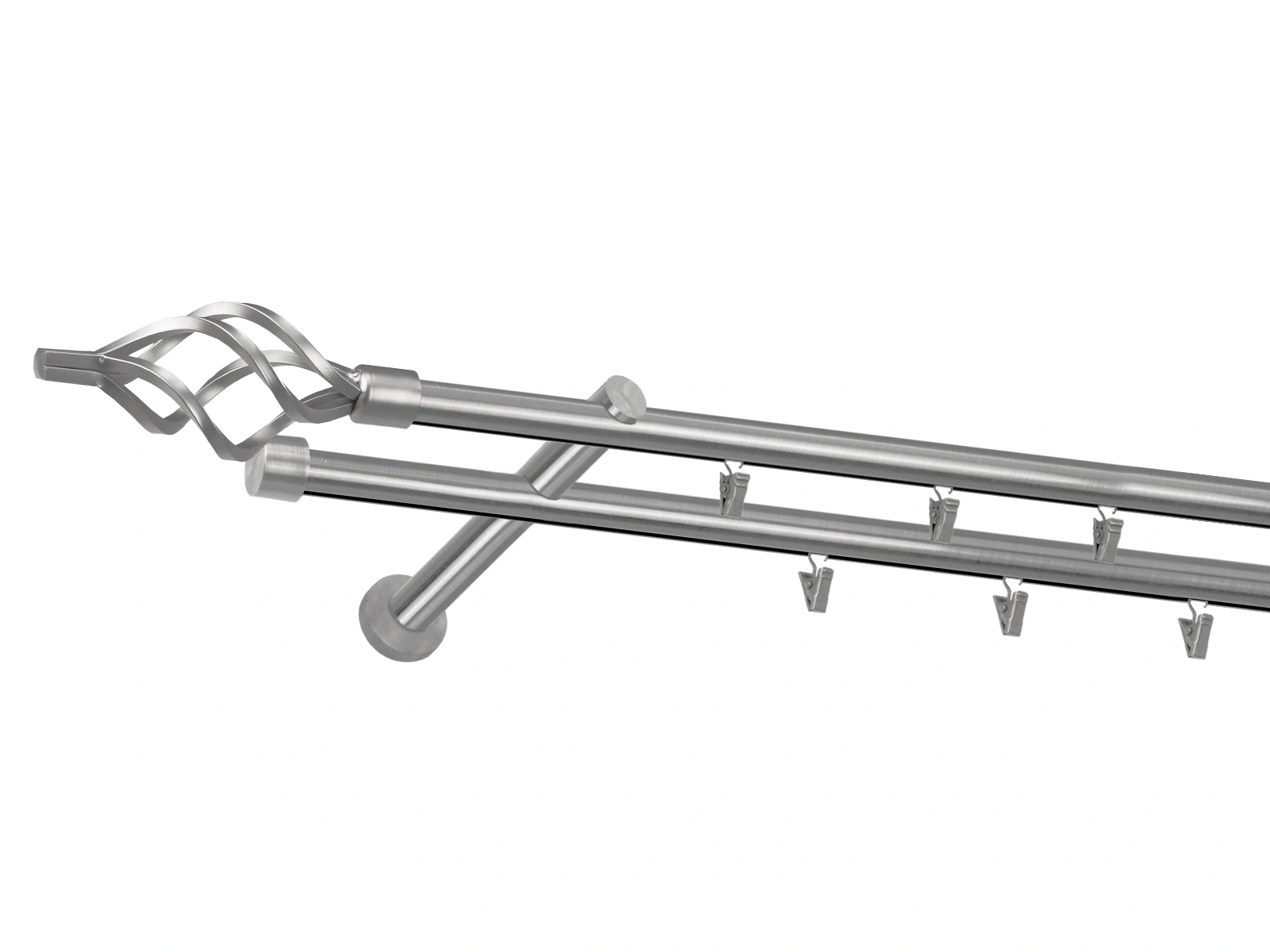 Dvojradová garniža s povrchovou úpravou - odtieň satin-nikel (matné striebro). Celokovové garniže s kvalitnou povrchovou úpravou - galvanické pokovovanie. Galvanické pokovovanie zabezpečuje vyššiu povrchovú tvrdosť, zvýšenú dolnosť voči poškriabaniu, hladký povrch. Dodávané sú v kompletoch.