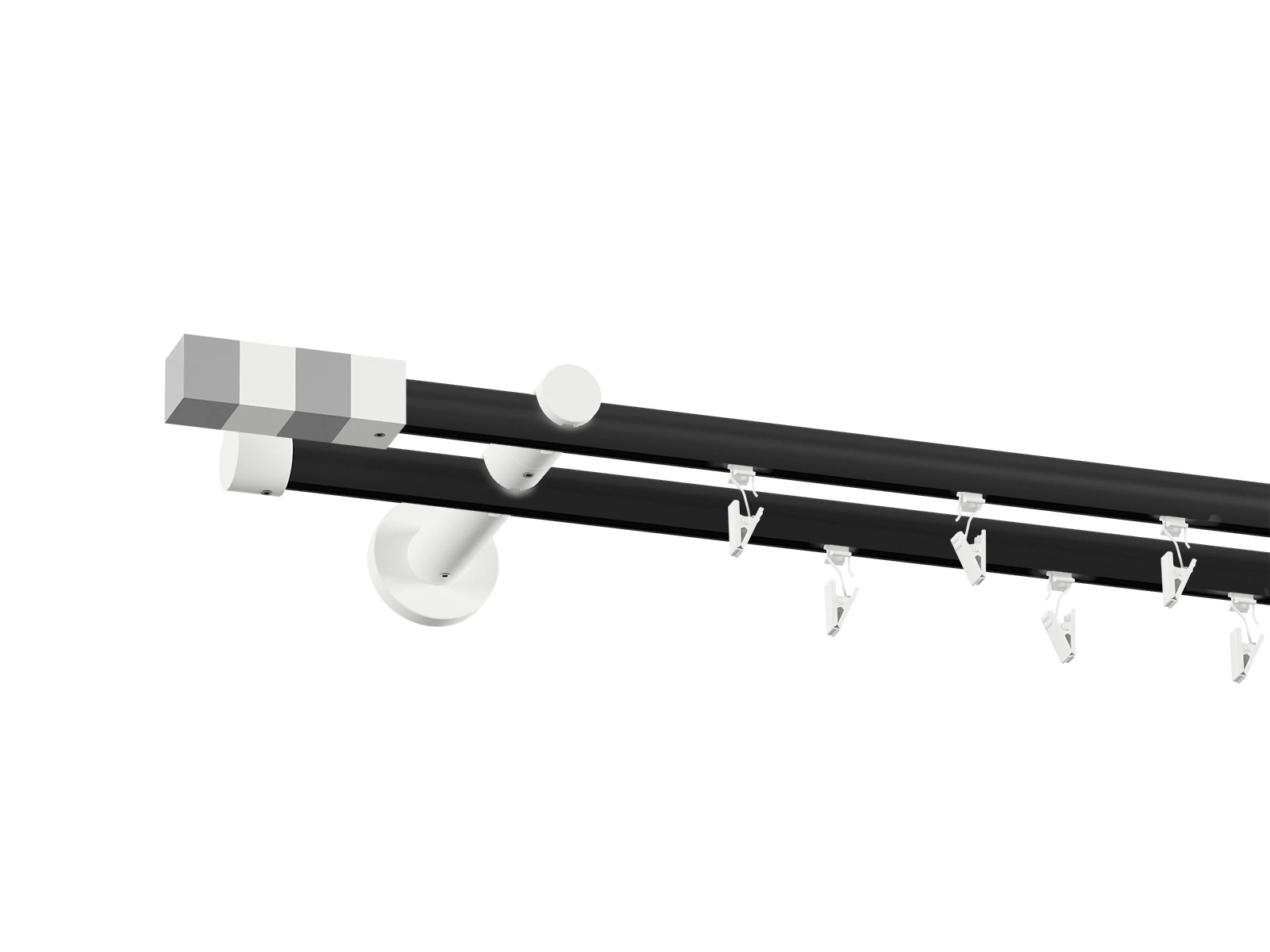 • Dĺžka 1600 mm - tyč 19mm - 1600mm - 2ks, držiak dvojitý - 2ks, koncovka - 2ks, koncovka zadná (PULLO) - 2ks, krúžok so štipcom - 30ks (pri výbere parametra príslušenstvo s krúžkami so štipcom), skrutky a hmoždinky na montáž
